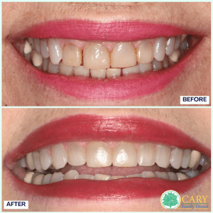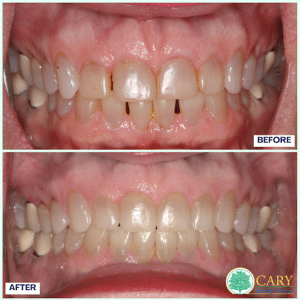 Color can be addressed with professional whitening, bonding, or veneers, depending on whether discoloration is intrinsic or extrinsic. Our patient’s discoloration lived in the old bonding, not her natural teeth, so removing it and whitening solved the problem.